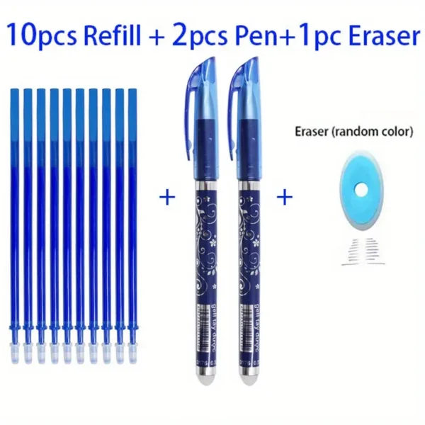 Set 2 pixuri cu cerneala termica cu 10 rezerve si 1 radiera mare sunt diferite fata de cele cu mina de pix  obișnuită. Pasta de pix se sterge prin frictiune cu guma din capul pixului.