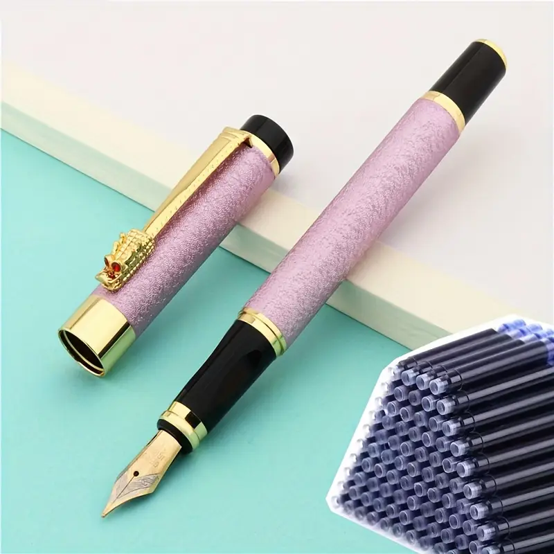 Datorită penitei Iridium, Stilou metalic Roz cu penita Iridium + 50 rezerve cerneala albastra, garantează o experiență de scriere fluidă și precisă, cu un punct de scriere medie perfect pentru notițele zilnice sau crearea unor texte elegante. Această calitate premium vă permite să dați viață ideilor cu ușurință, fie că scrieți într-un jurnal personal sau semnați documente importante. Stiloul este compatibil cu cerneală albastră, iar cele 50 de rezerve incluse asigură o durată îndelungată de utilizare fără inconveniente.